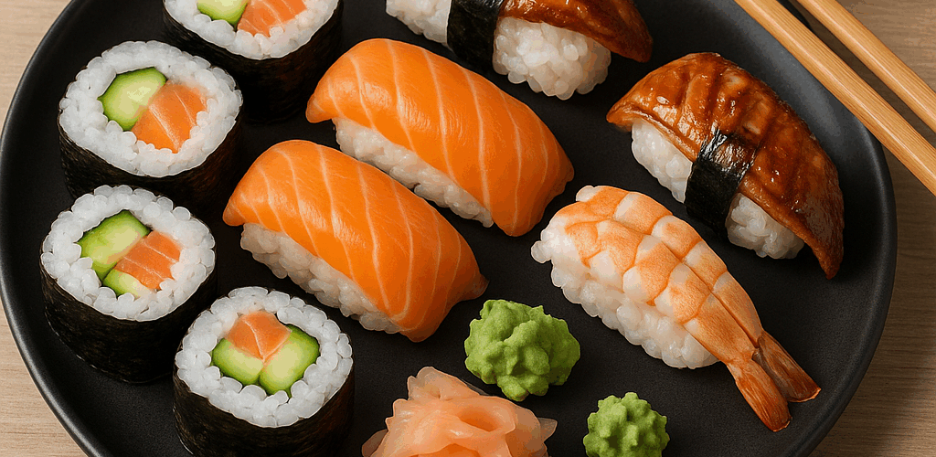 • رتبي السوشي في طبق جميل وقدميه مع صويا صوص، واسابي، وزنجبيل مخلل